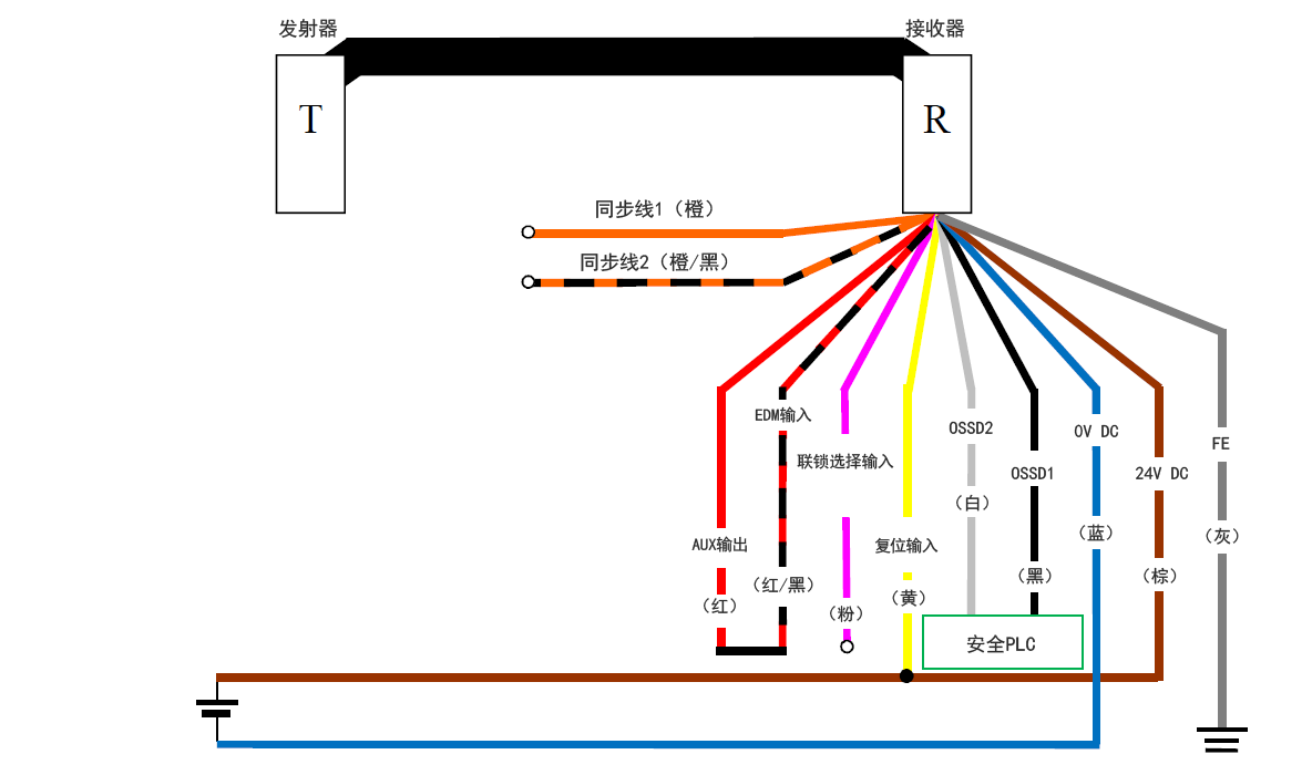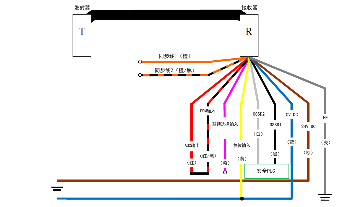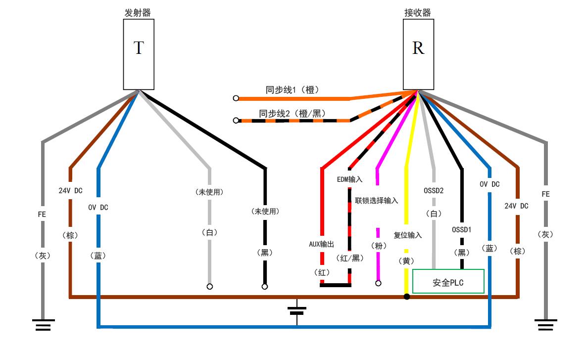- 请将安全PLC的0 V与GL-R的0 V相连接。