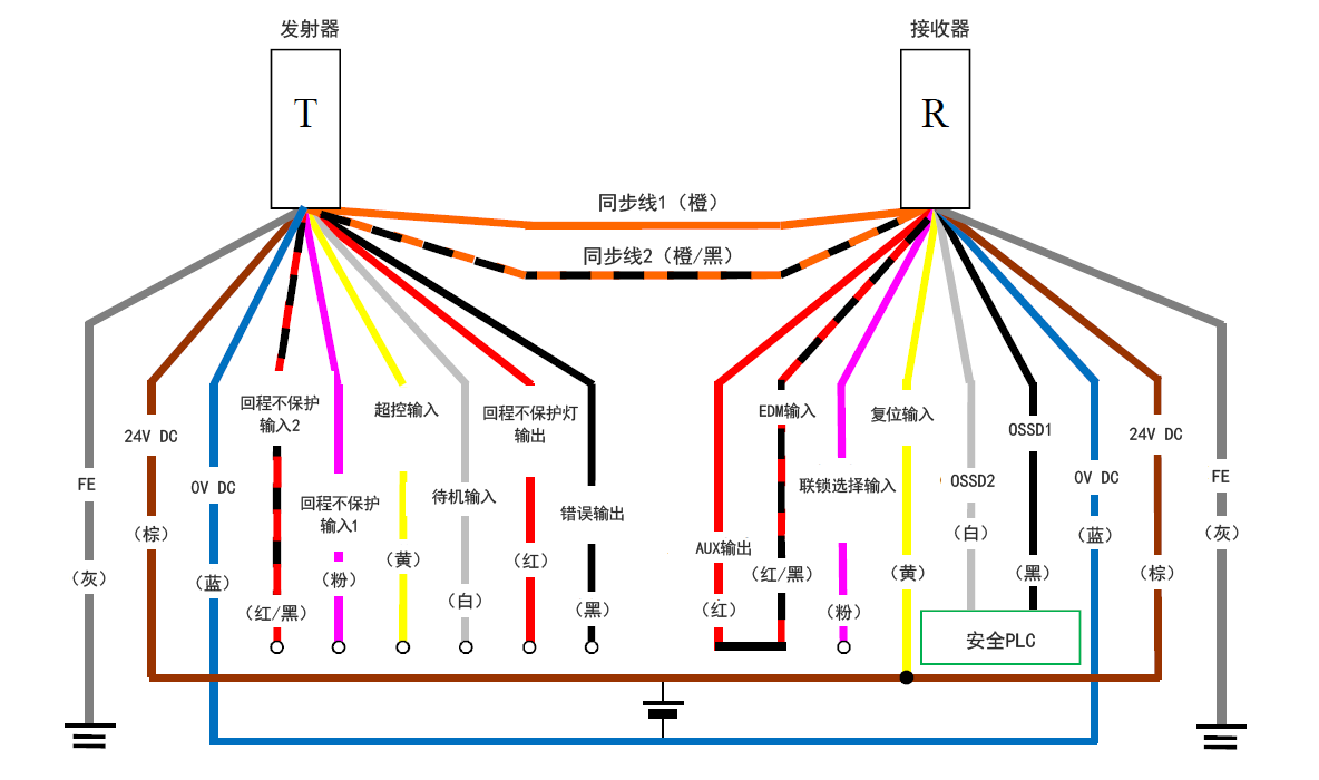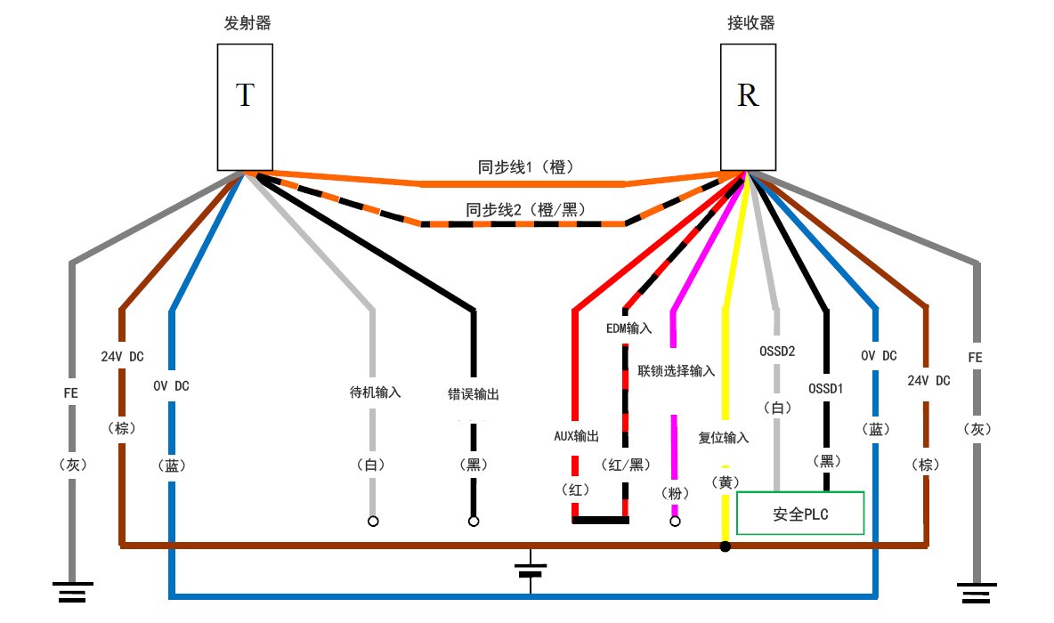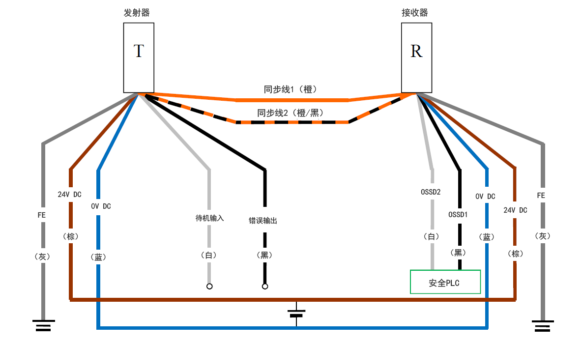 - 请将安全PLC的0 V与GL-R的0 V相连接。