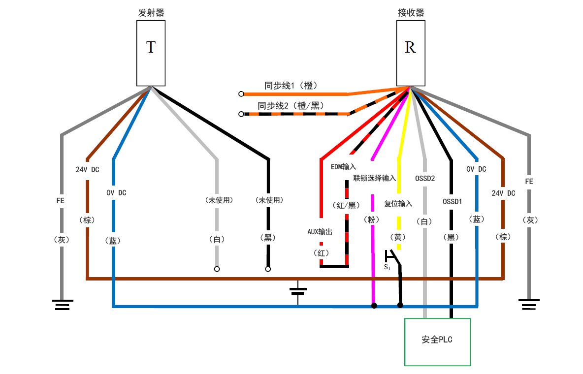 - 请将安全PLC的0 V与GL-R的0 V相连接。