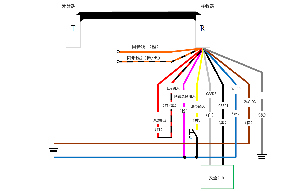 发射器(T) - 接收器(R) - 橙(同步线1)、橙/黑(同步线2)、红(AUX输出) - 红/黑(EDM输入)、粉(联锁选择输入)、黄(复位输入)、白(OSSD2)、黑(OSSD1)、蓝(0 V DC)、棕(24 V DC)、灰(FE) | 黄(复位输入)- S1 - 蓝(0 V DC) | 粉(联锁选择输入) - 蓝(0 V DC) | 安全PLC - 白(OSSD2)、黑(OSSD1)