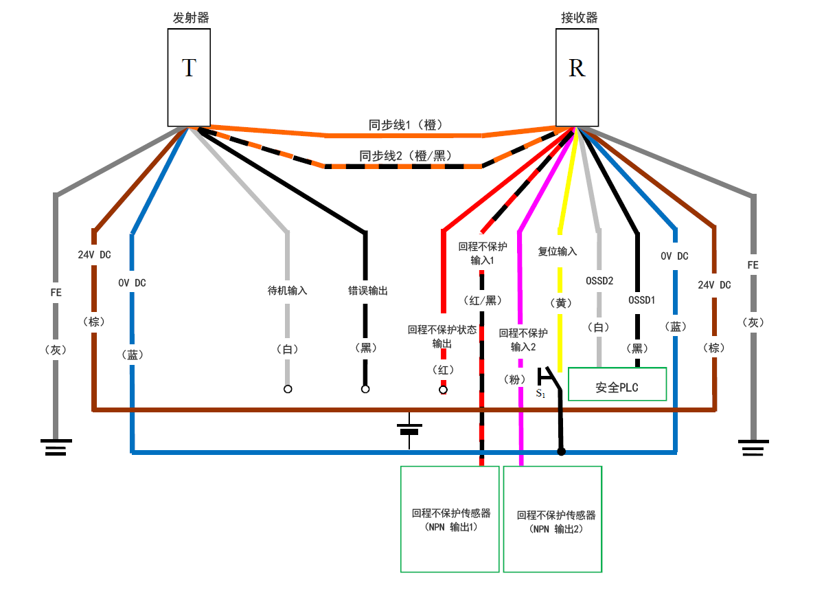 - 请将安全PLC的0 V与GL-R的0 V相连接。